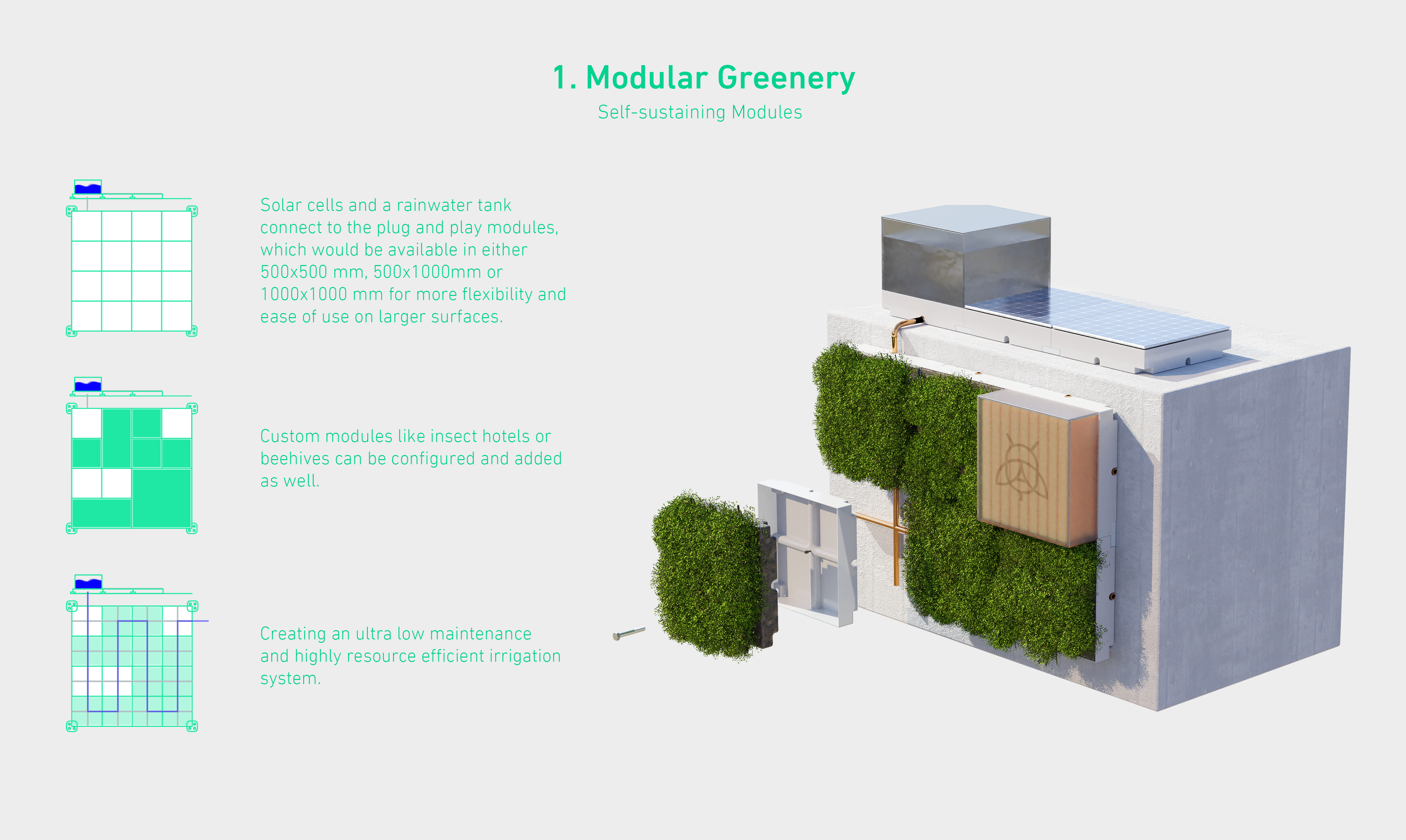 The modules would be available in either 500x500mm,500x1000mm or 1000x1000mm for more flexibility and ease of use on larger surfaces. Solar cells and a rainwater tank connect to the plug and play modules, creating ultra-low maintenance and a highly resource-efficient irrigation system. Custom modules like insect hotels such as beehives can be configured and added as well.