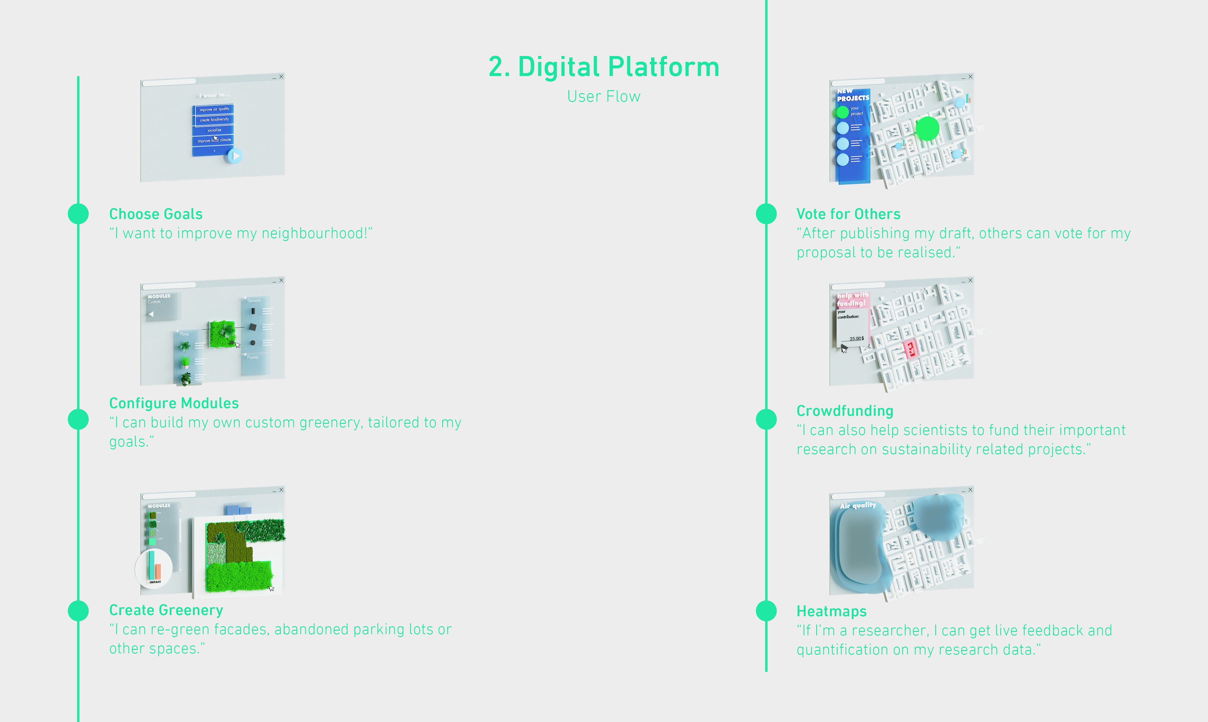 The user journey starts with choosing a goal, such as “improving the air quality around my neighborhood”.The AI-powered configurator then guides the user to pick the best place for this goal. By simply just dragging and dropping the greenery modules, users can re-green facades, abandoned parking lots, or other spaces. If the platform is used by a researcher, the greenery modules can be customized by adding sensors to collect data for specific needs. After publishing the project draft, other civilians and the municipality can vote or crowdfund the project. The more projects are created, the more data will be collected through the platform, which then would create heatmaps to inform civilians and researchers.