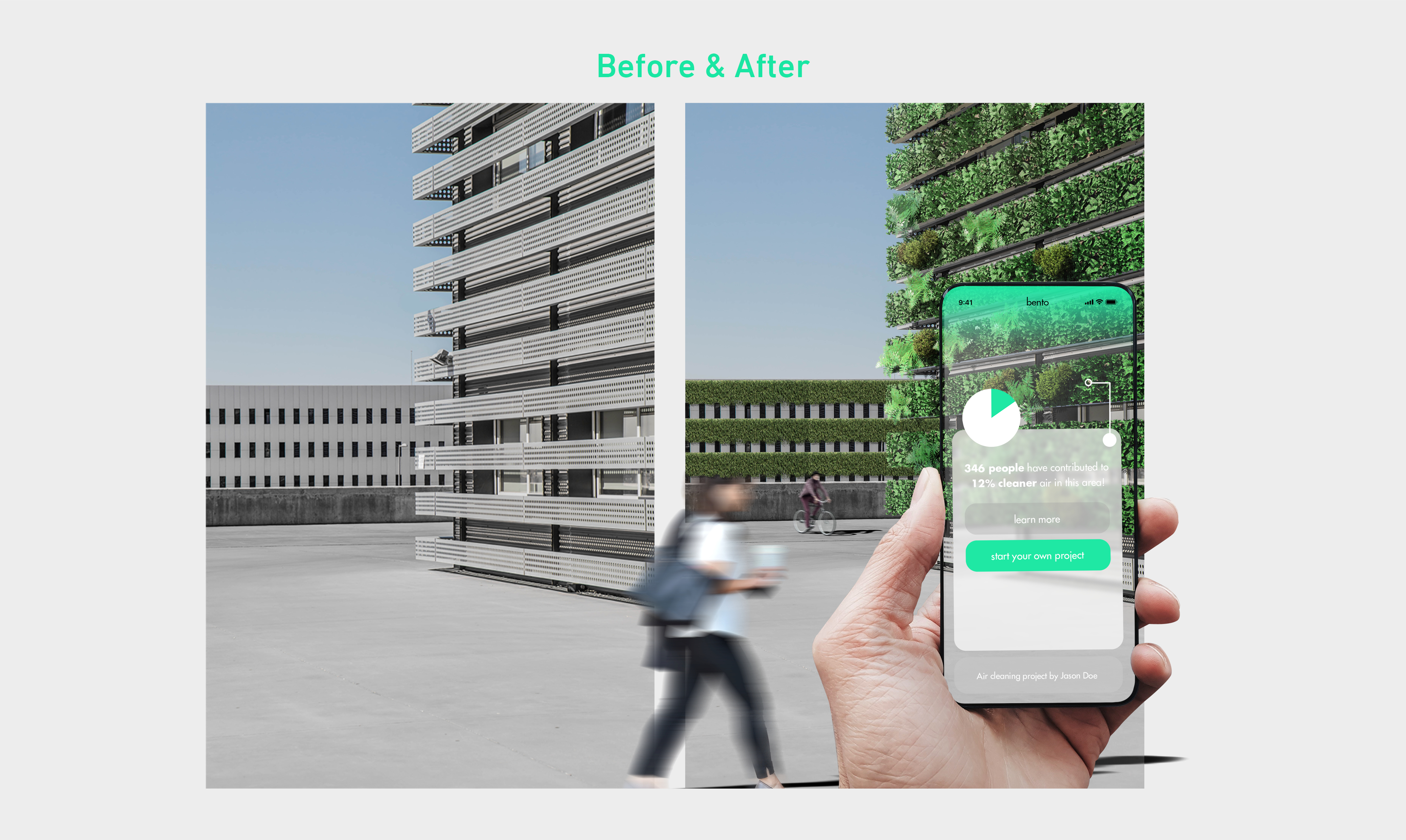 Bento includes modular greenery and a digital platform that encourages citizens to get informed and be involved in shaping the cityscape. This platform will also be used by professionals like city-planners and scientists to fund and conduct research to improve the aforementioned issues. Through this, we can leverage everyone’s expertise more democratically and efficiently.