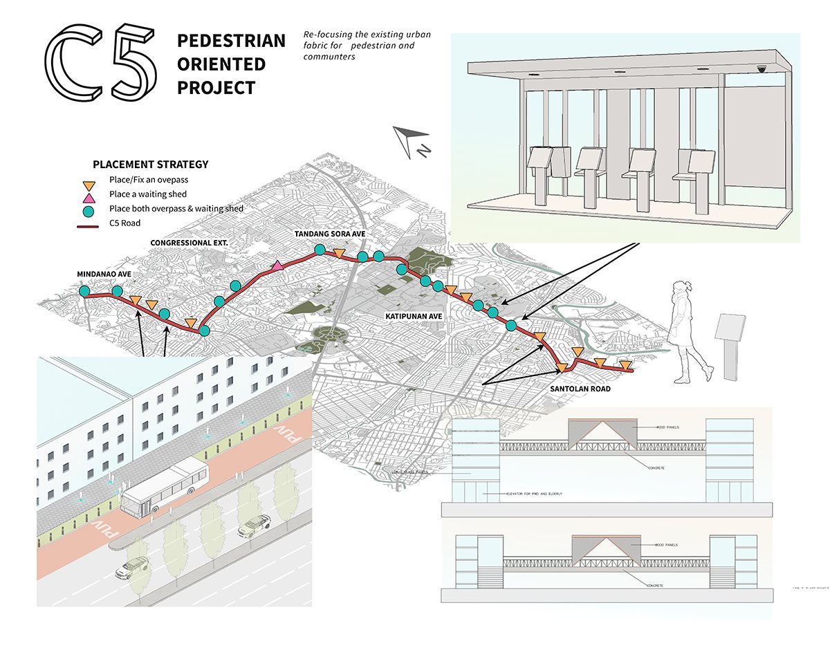 The C5 Pedestrian Orientated Project tackles the issues that contribute to the compromised quality of the existing pedestrian infrastructures. By determining these factors, we were able to come up with designs and solutions to meet the needs of the pedestrians. These solutions include providing more pedestrian overpasses that are PWD and Elderly User friendly, waiting sheds that will lessen loitering and vandalism, and utilizing innovating crossroads that protect both crossers and drivers from accidents.