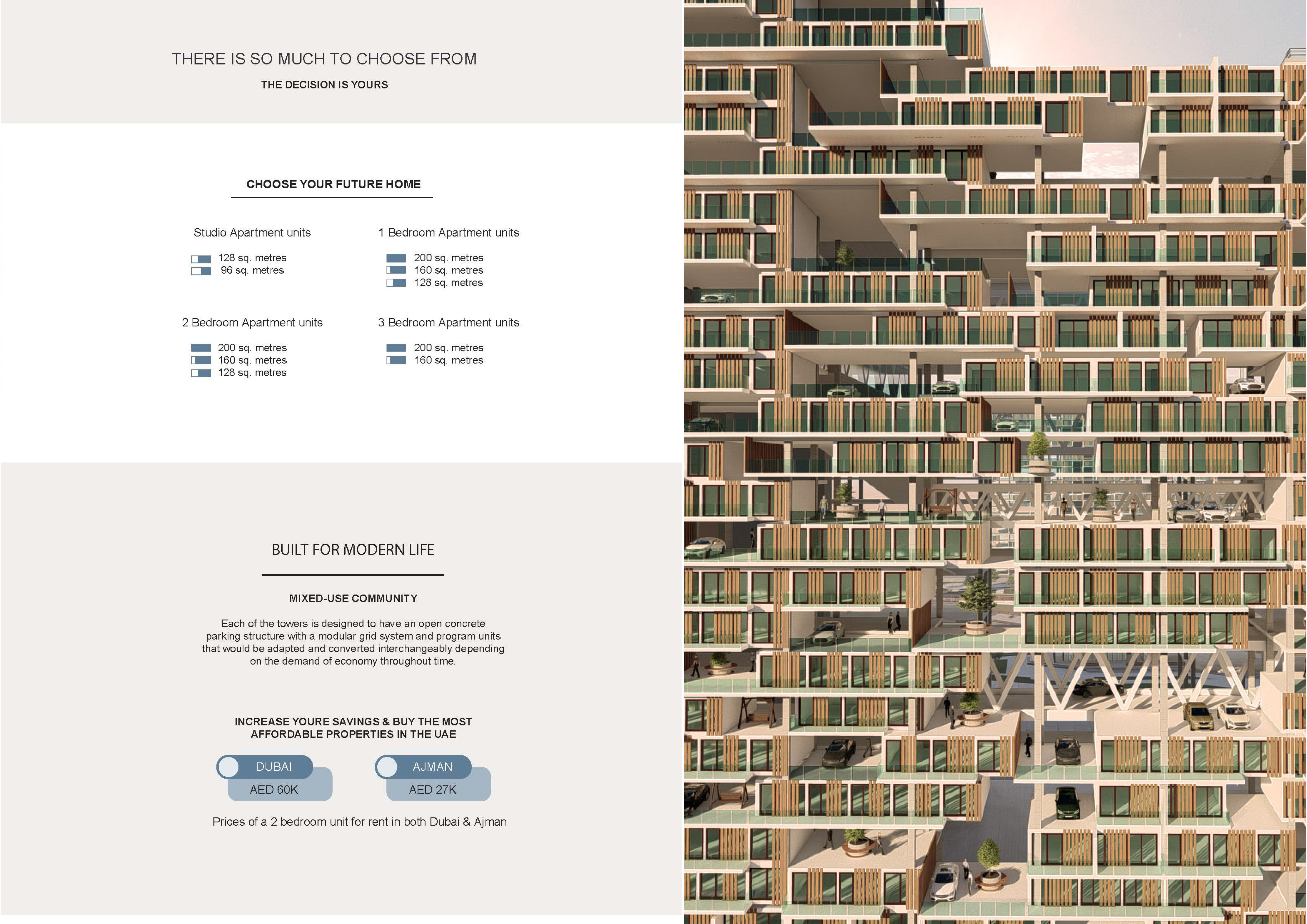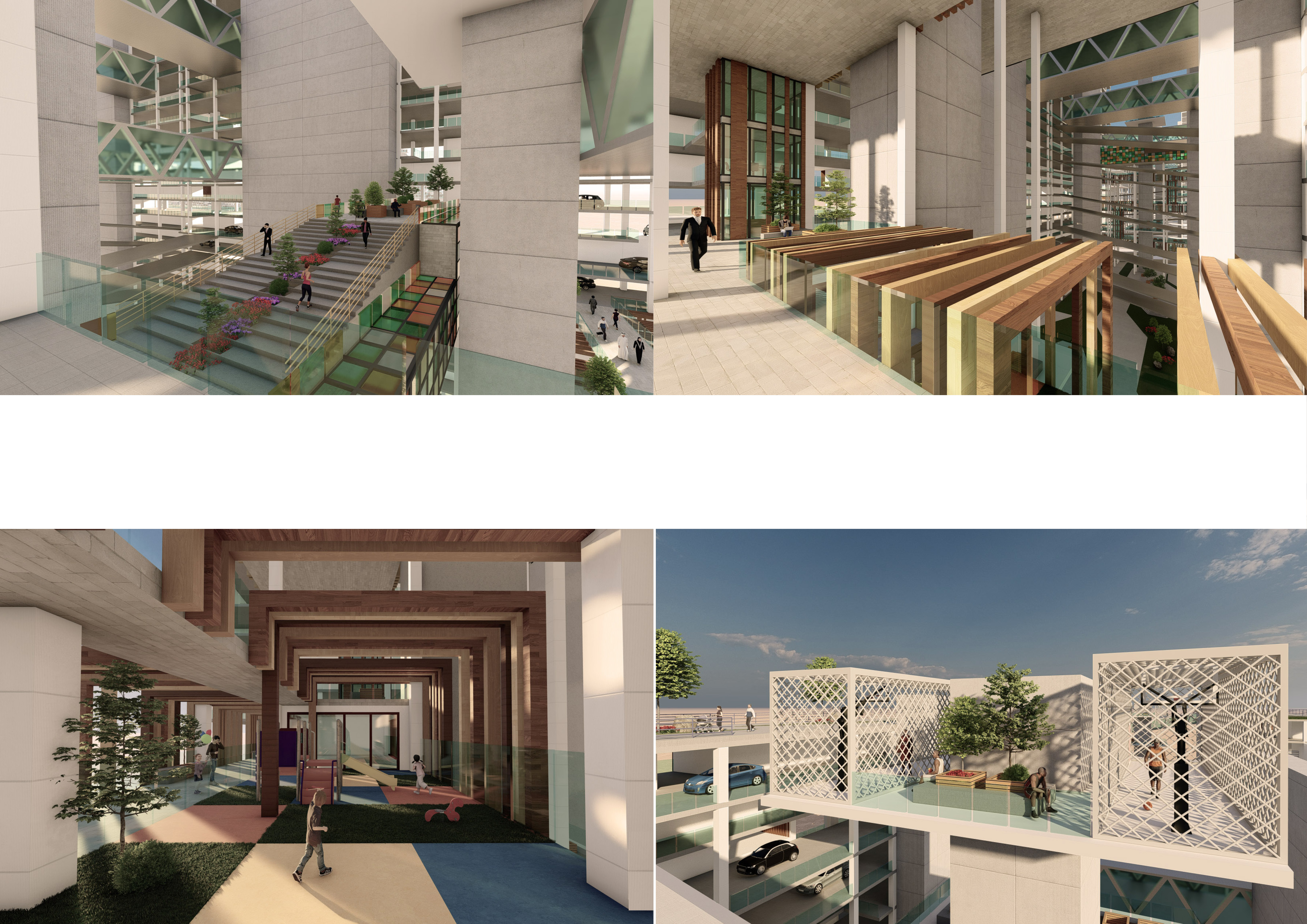 The site before the proposal consists of a cluster of residential towers in different construction stages that are relatively placed close to one another. They all have the same typology, style and height in which these towers rest on a multi-storey parking structure as a podium. However, the density, the organization and proportion of these towers made the site look as a dense concrete jungle of towers that lacks an interactive space for the residents to socialize. Although, the rent is relatively cheap, yet the design of these typologies does not accommodate bachelor housing, making it a major problem in Ajman. The bachelors currently live in labour camps and share an apartment with a minimum of four other men, living together with very minimal privacy. Even married men chose to live with other bachelors as they cannot afford zones that cater to families. So the project provides flexibility of modular housing units that can be adjusted to everybody’s needs.