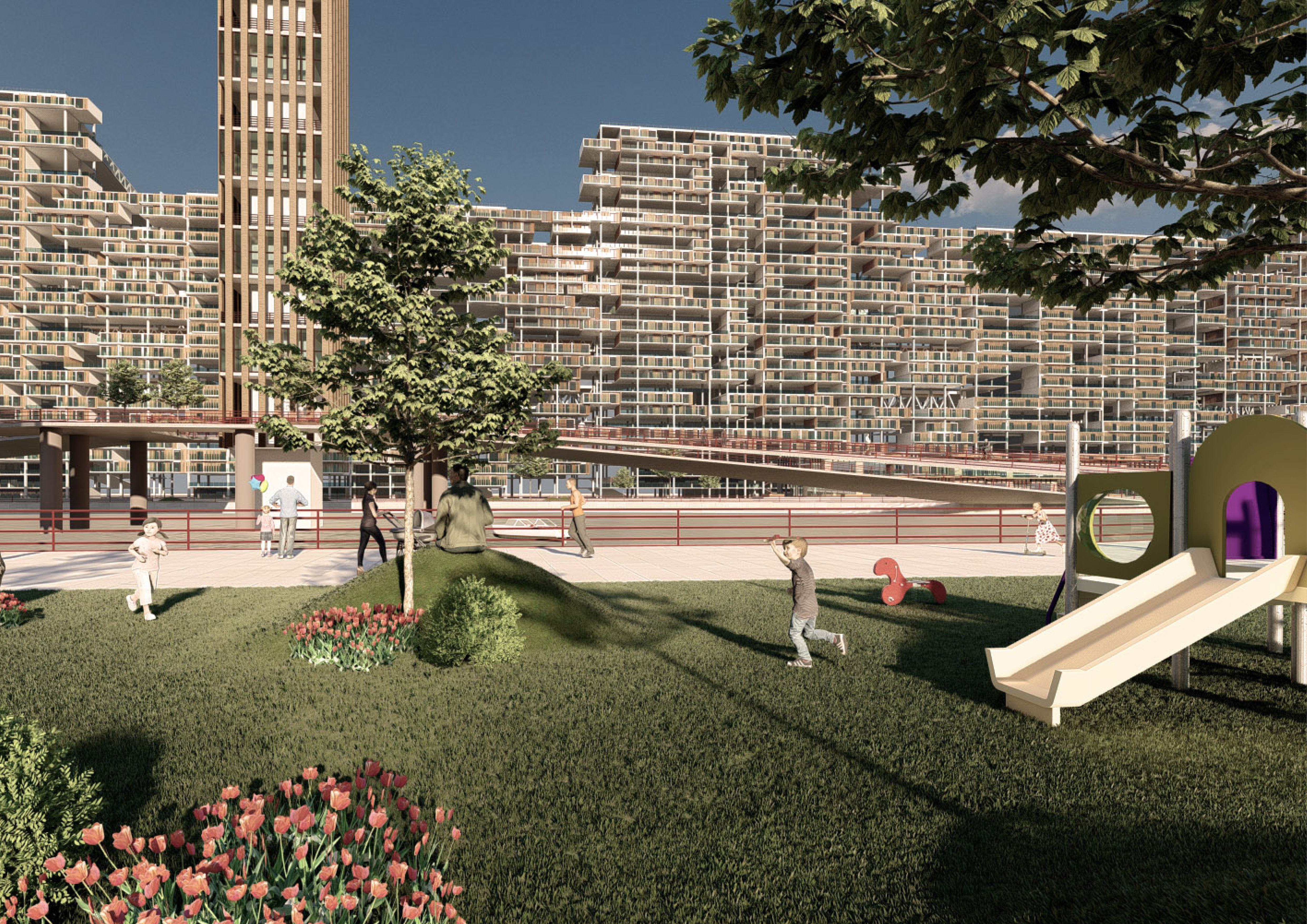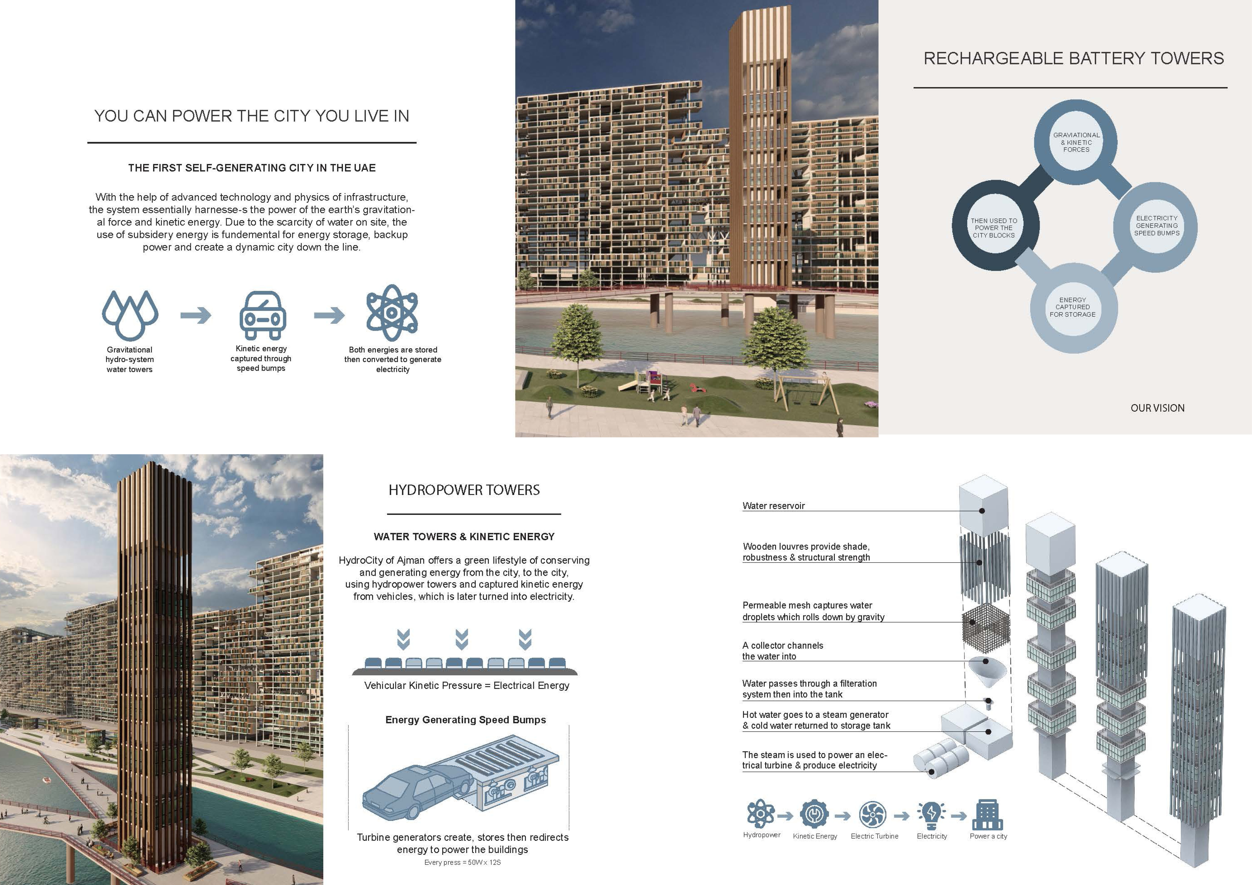 Environmental- The project proposes the use of hydropower towers which are located in the center of the master plan and captured kinetic energy from vehicles. So, both of these forms of energy are used to generate electricity and provide it back to the grid and the hydrocity block sustainably.