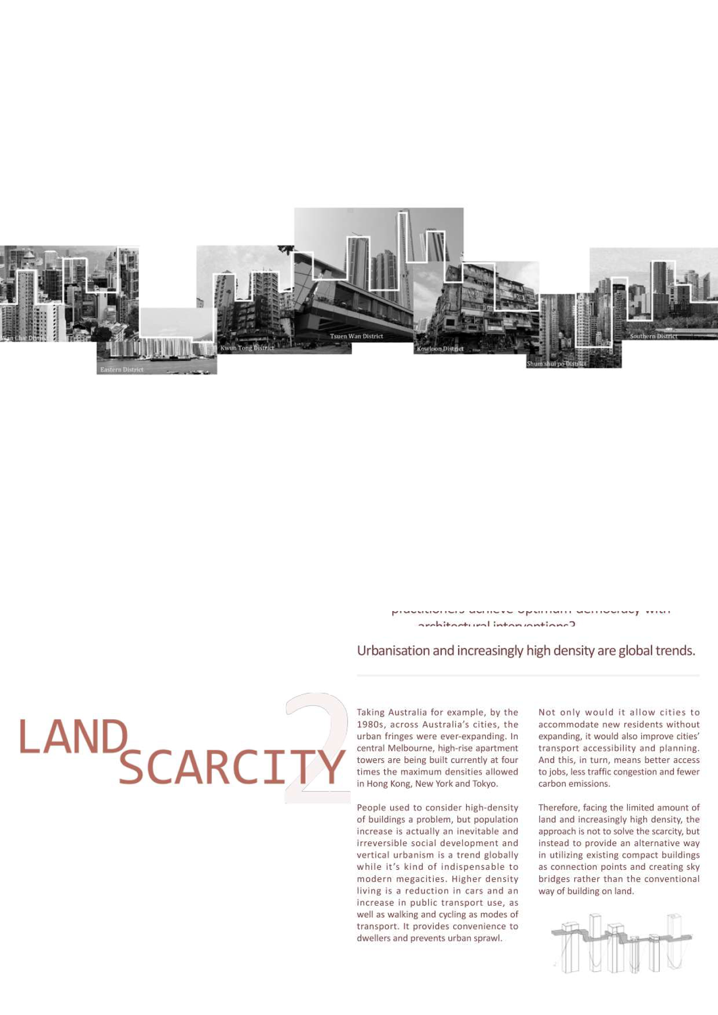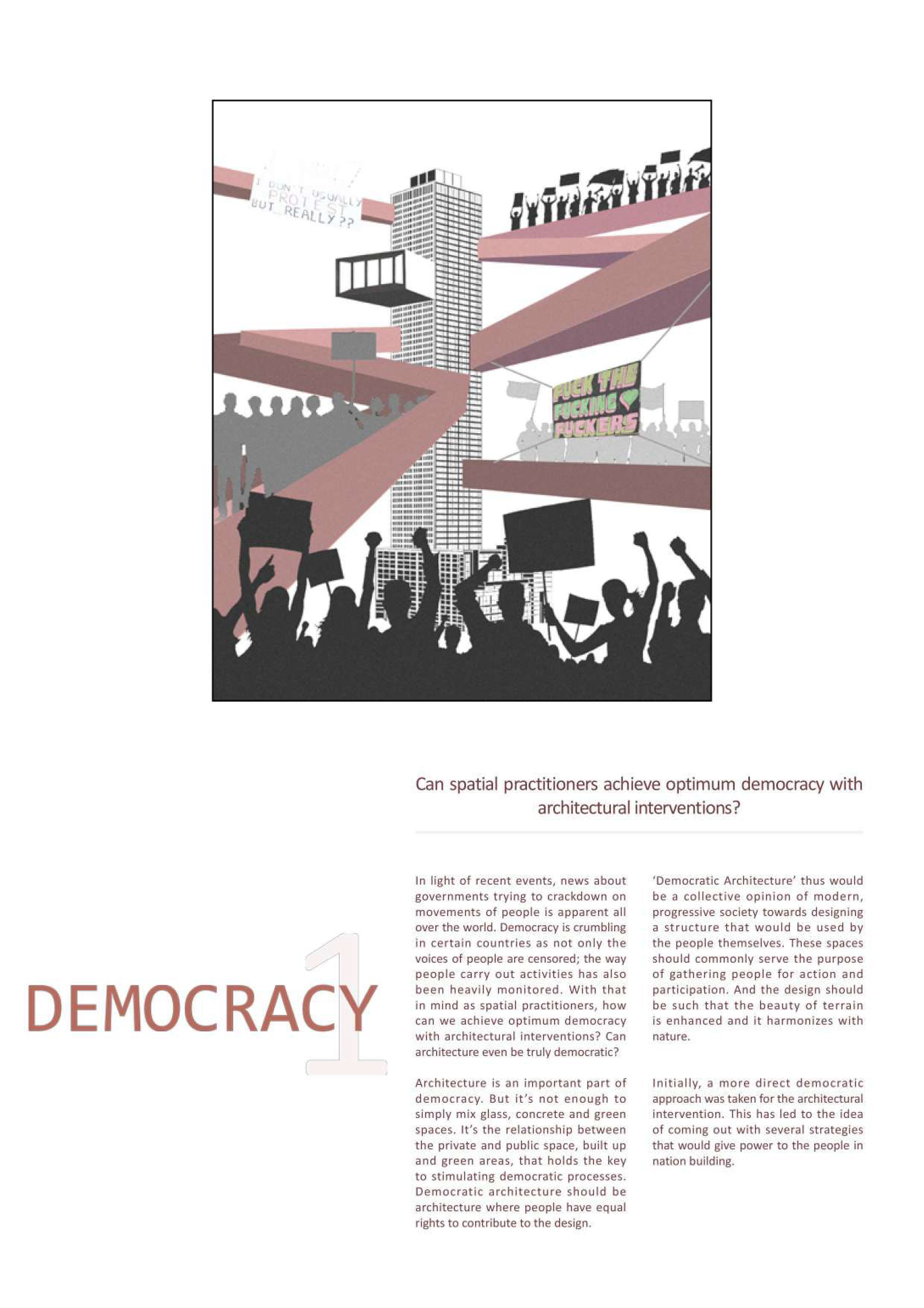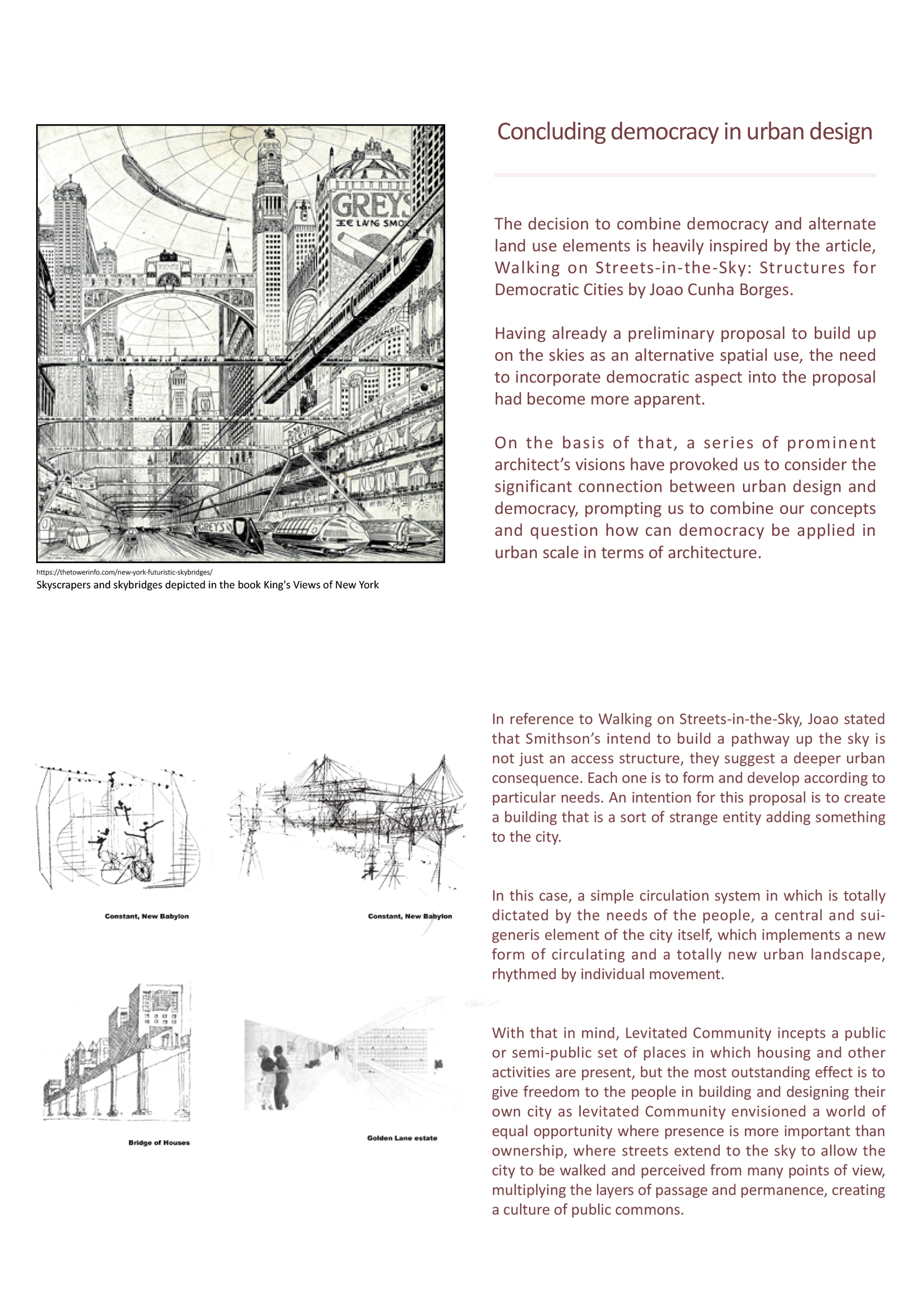 The decision to combine democracy and alternate land use elements is heavily inspired by the article, Walking on Streets-in-the-Sky: Structures for Democratic Cities by Joao Cunha Borges.