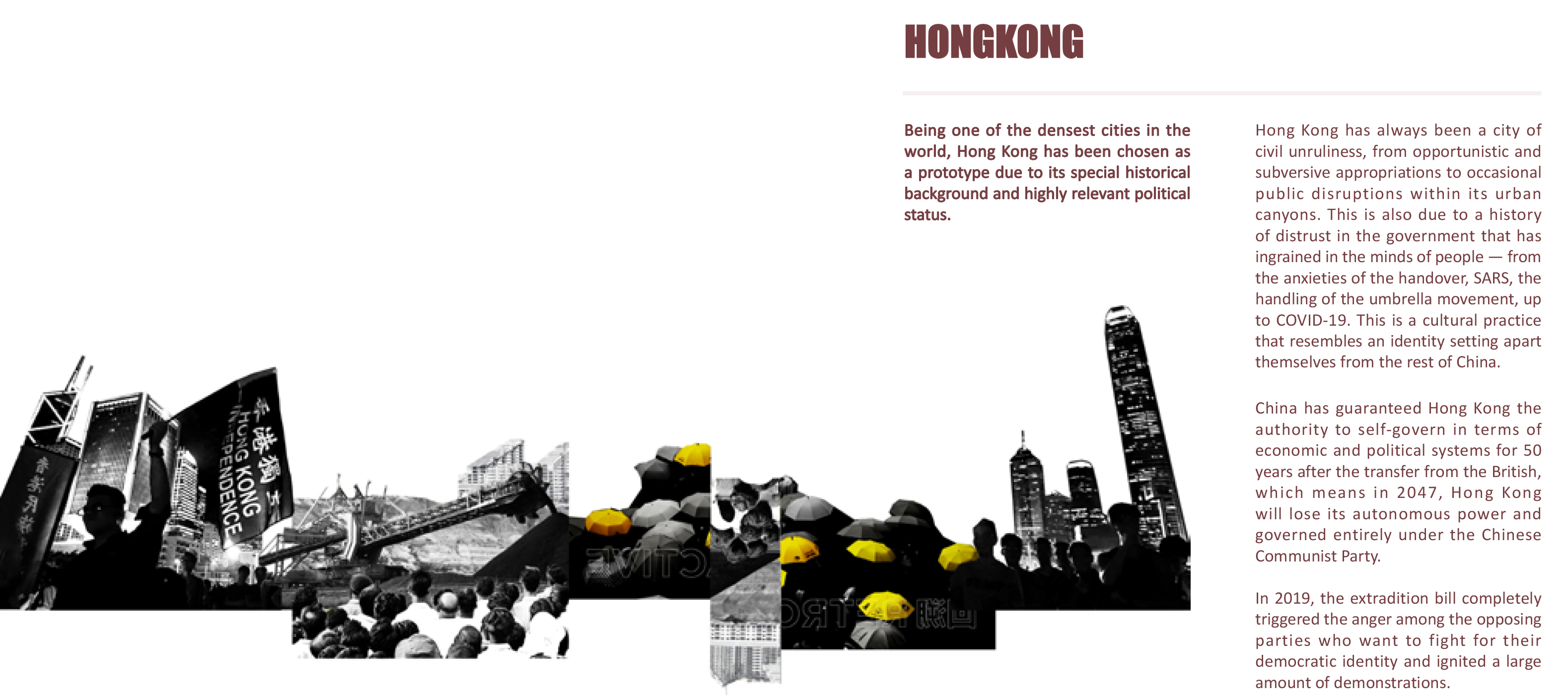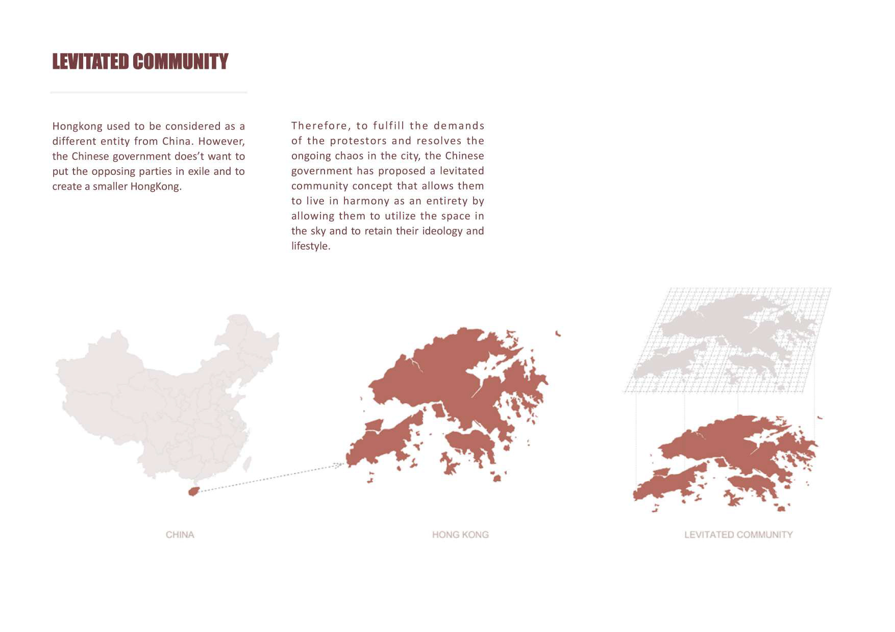 Levitated Community investigates the evolving qualities of urbanity in today’s society where land has been so scarce along with the politicization of it to curb the freedom of speech of the people. Our proposal seeks to negotiate the complex geopolitical relationship between autonomous Hong Kong and China, while prognosticating a future for Hong Kong’s state of being after guaranteed autonomous rule ends starting from the year 2047. It is an architectural elucidation and perpetuation of a condition of cultural practice rather than codification China’s ascendancy and Hong Kong’s anxieties – a perverted sense of history repeating itself, a situation that demands to be assuaged for stability. Architecture is an important part of democracy. But it’s not enough to simply mix glass, concrete and green spaces.
