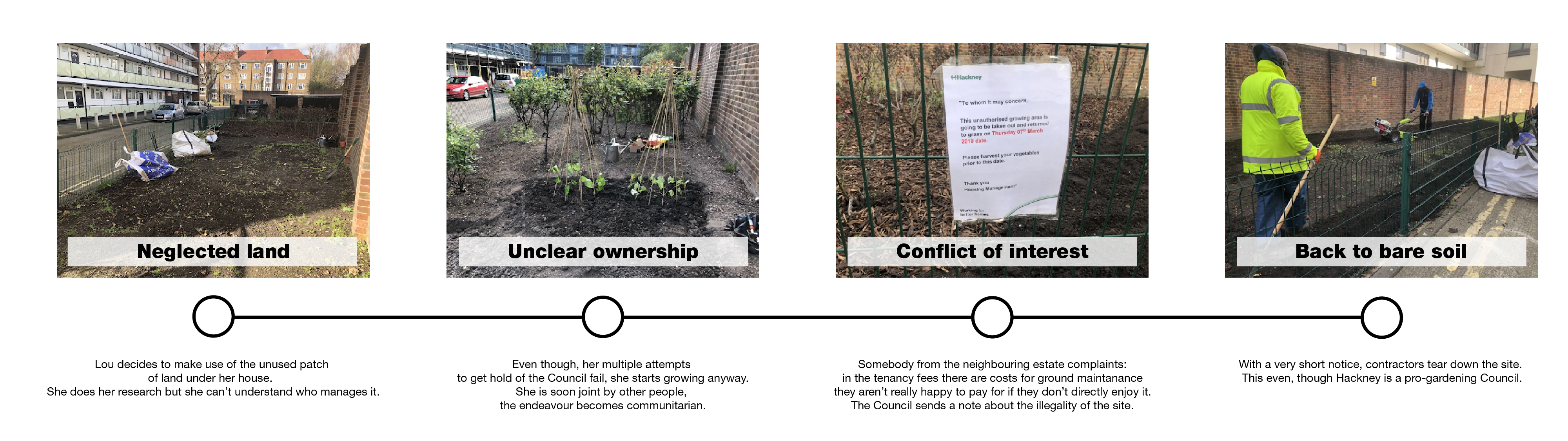 Land has always been a disputed resource, especially in urban settlements. However, urban green spaces and their importance in urban ecology has been emphasised in recent times. They enhance the local biodiversity, build resilience to floods, improve air quality and most importantly build communities within a local area and to some extent, even shorten food chains. Despite known benefits, urbanisation has massively reduced scope for building such sites within cities. Moreover, austerity measures have obliged local authorities to keep them on low priority. Particularly in maintenance of small patches that are mostly appreciated by the locals. We are also witnessing a rise of citizens that wish to proactively engage with local spaces but are restricted by two main reasons: -Difficulty in establishing ownership of land and its management model -Absence of a system to collectively take action leading to clashes between communities because of conflictual views on its usage