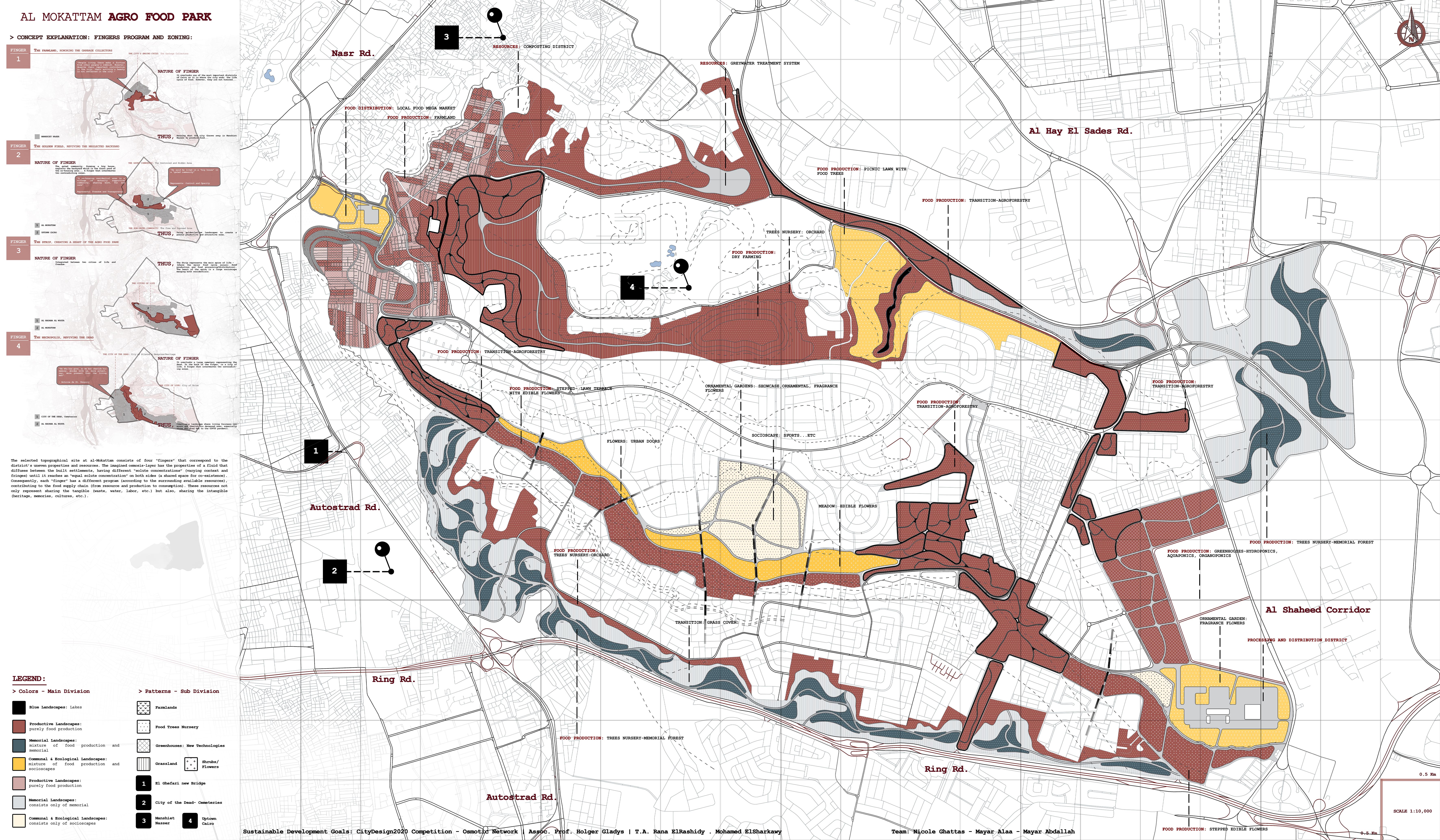 From a territorial approach of upscaling Cairo with foodscapes to the selected site of Al Mokattam, spanning on four “fingers”… The shared space for sustainable co-existence is designed as follows: