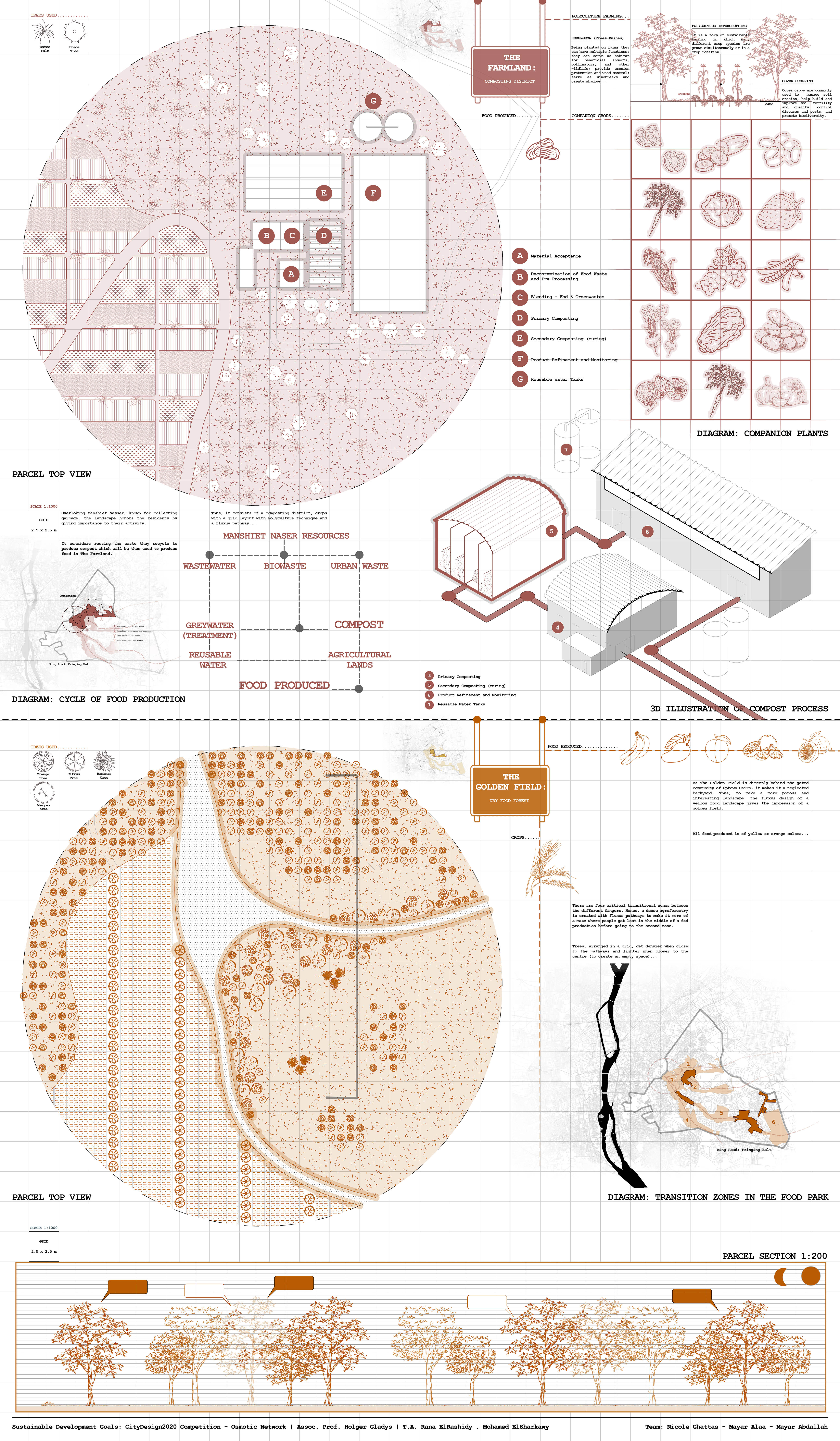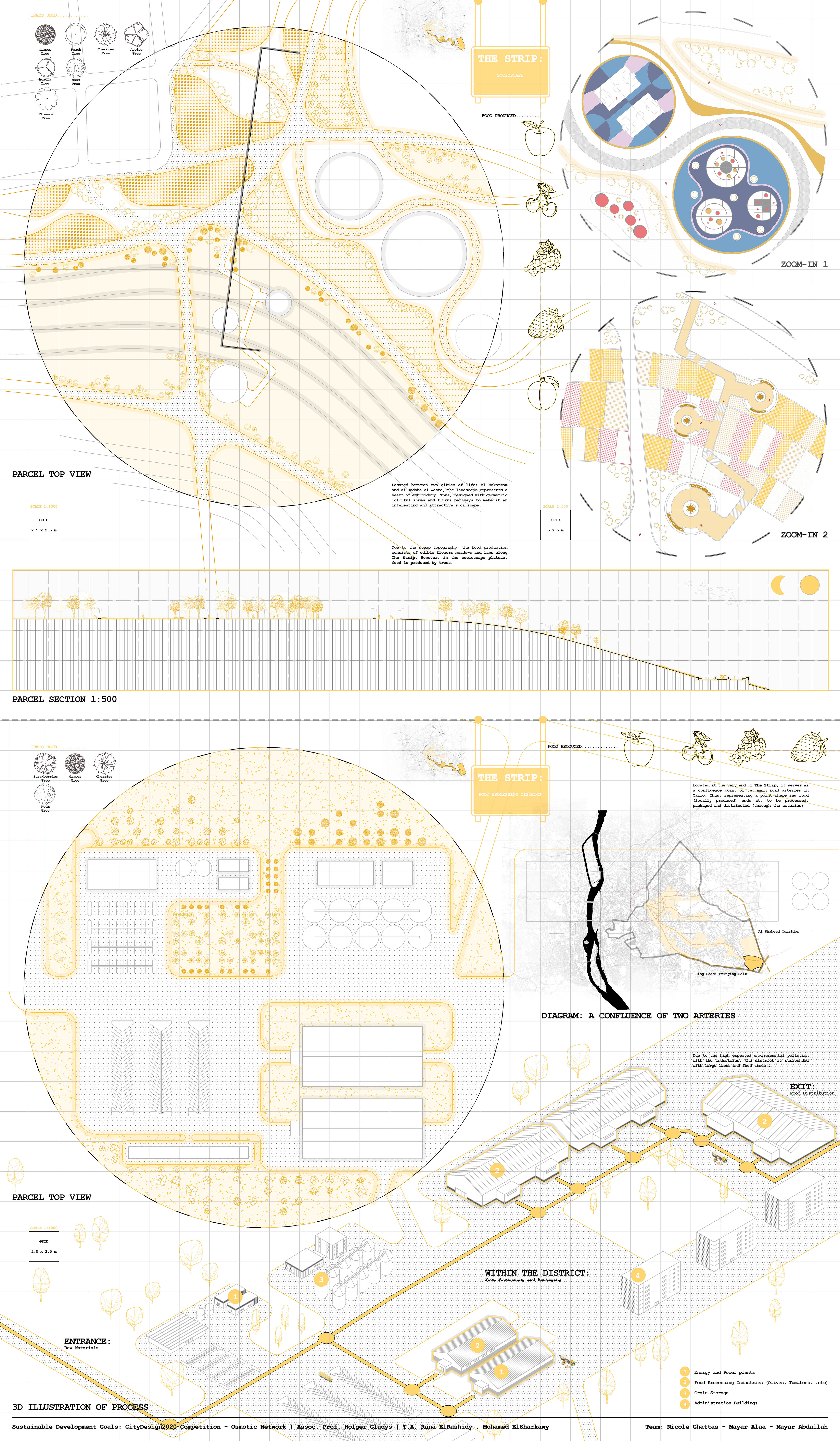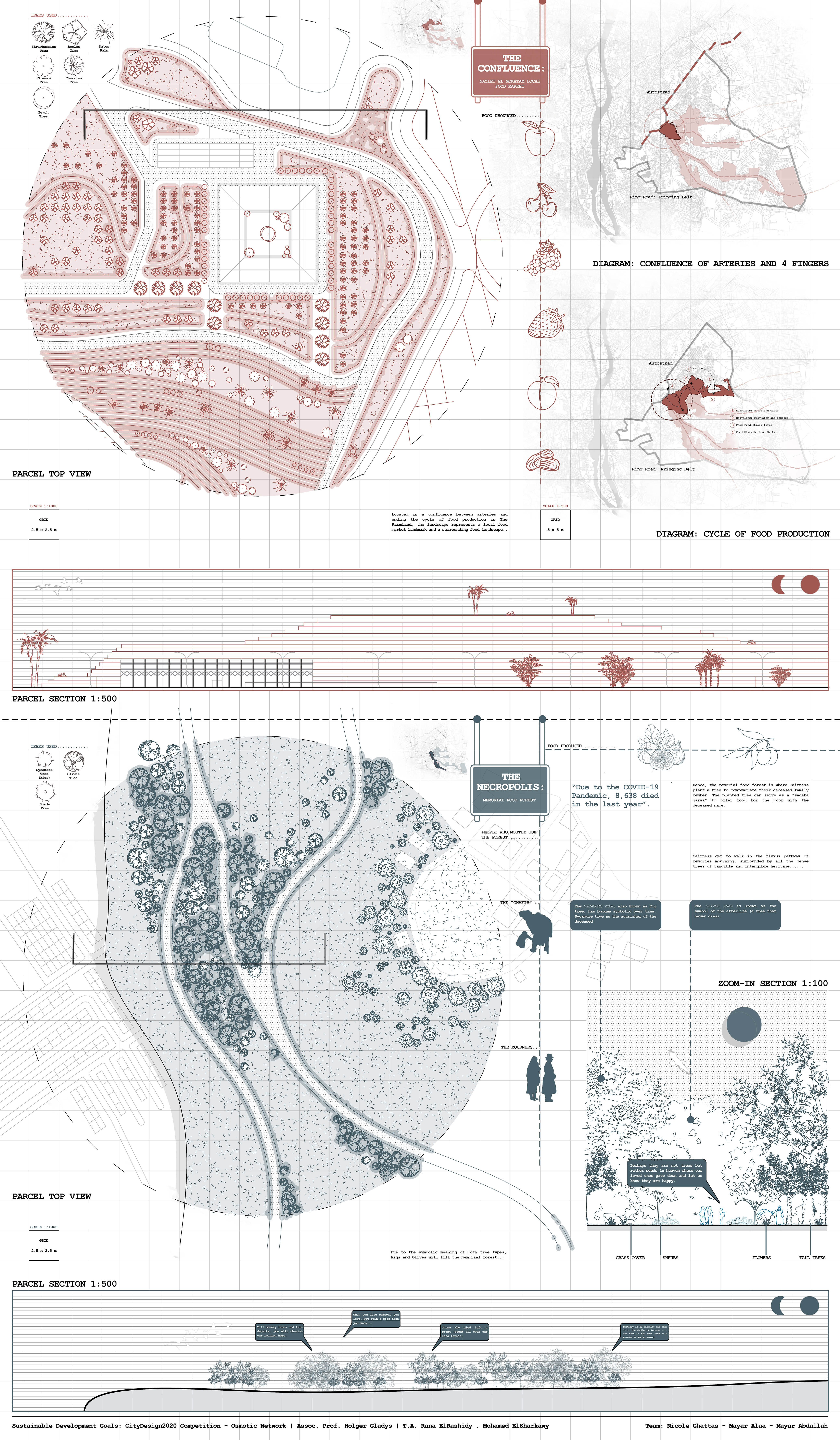 Tying the land overlooking the garbage collectors (where the city’s end cycle/rubbish end) to the land overlooking the city of the dead (where humans life end); they both represent main recycled resources (tangible: waste/water and intangible: memories) that contribute to the sustainable production of the living lands food: a source of life… Hence, recycling to represent a Second Chance at life to learn to appreciate things from the beginning before it is too late.