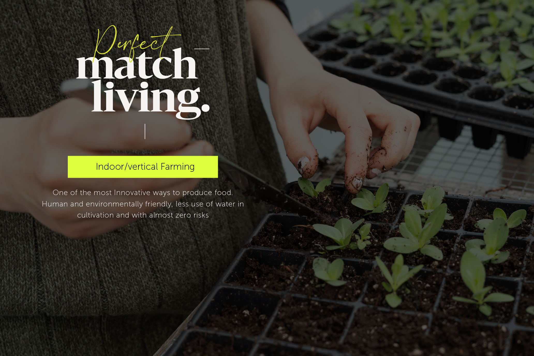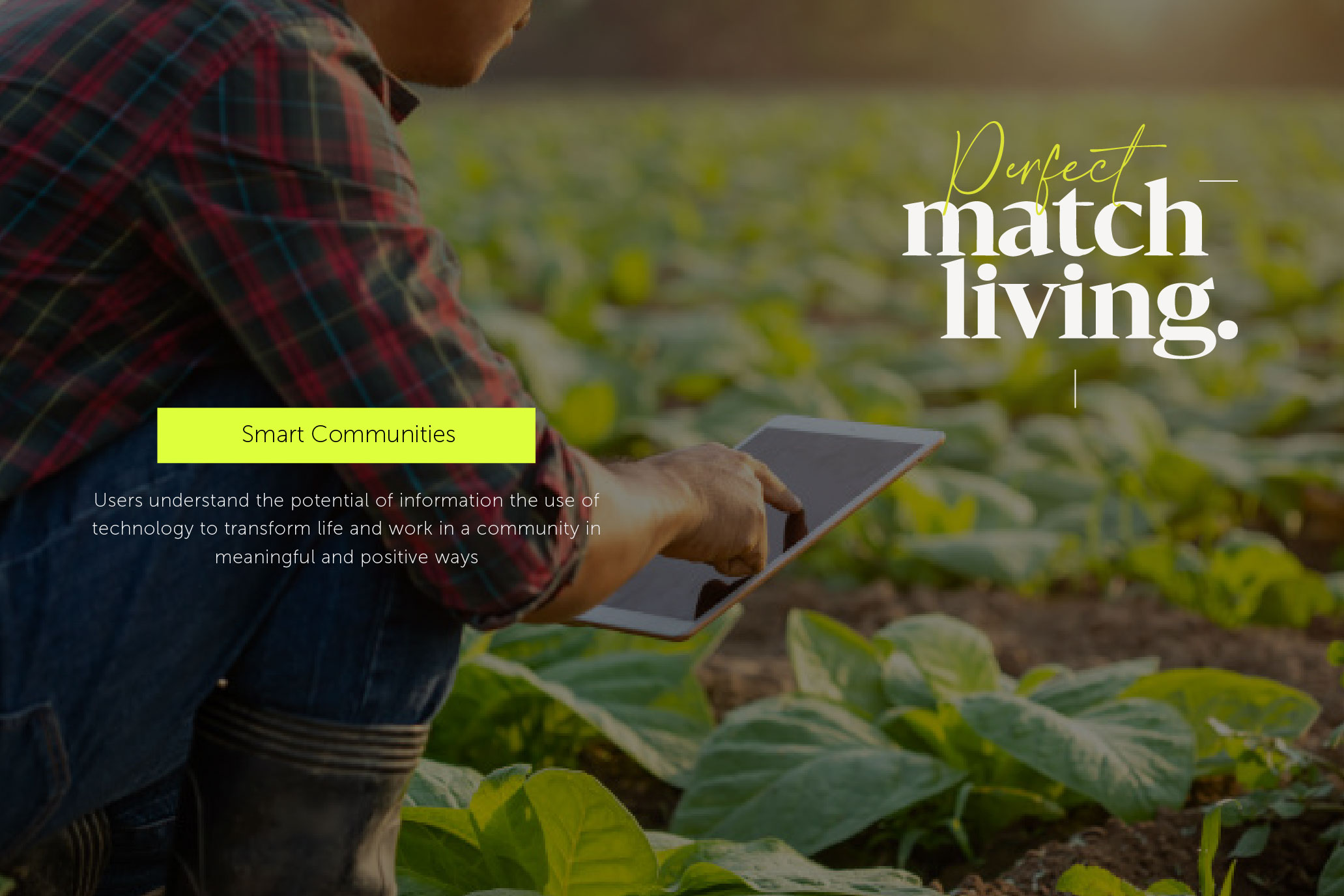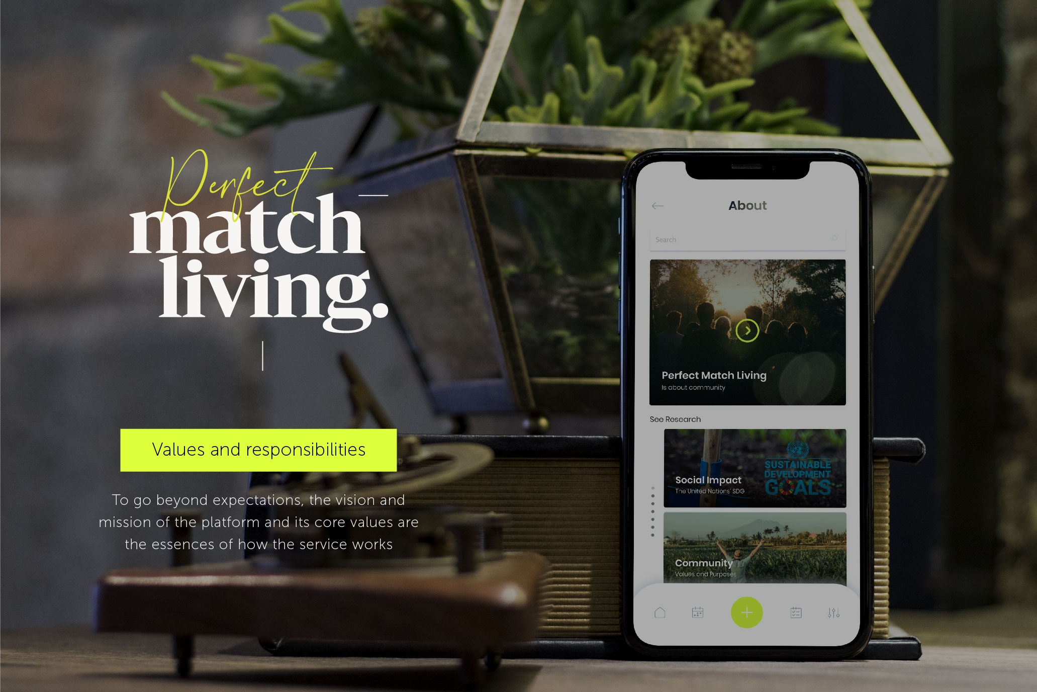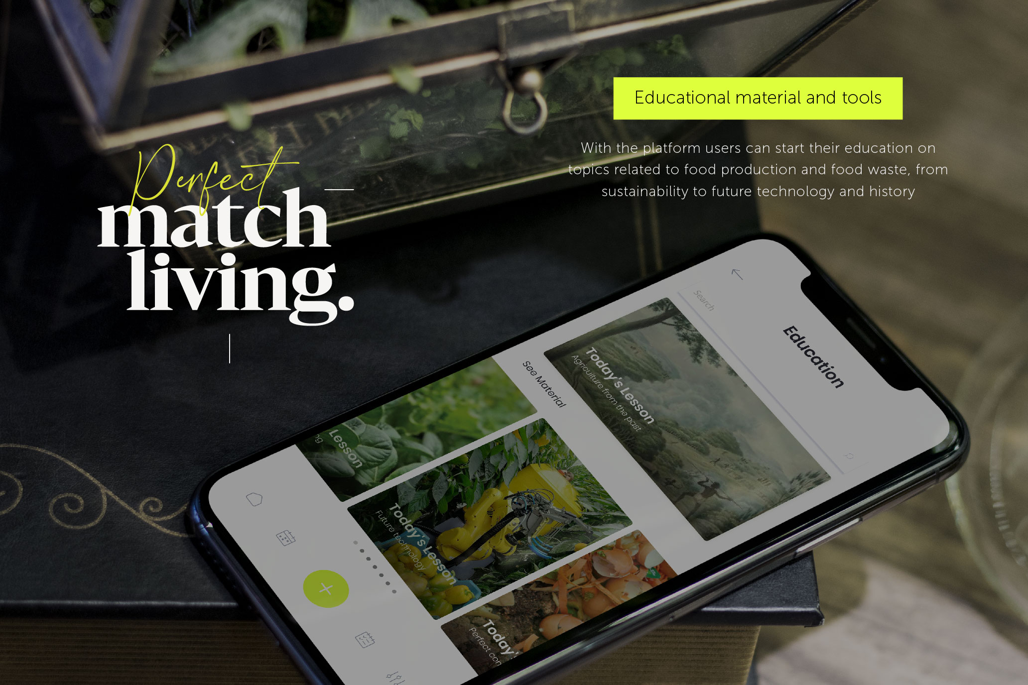 The service ‘Perfect Match Living’ is the platform that helps people build and organize a residential sustainable agriculture system within a community. It addresses the issue of sustainable food production which is a concept that involves cultivating plants with livestock on small inclined spaces with techniques such as; hydroponic and compost systems where there is a lack of available land space for healthy food. Even more, it forms a circular food production and food waste system with integrated technological tools, creates a balanced environment, and builds community by teamwork giving different roles to its users depending on their needs and talents.