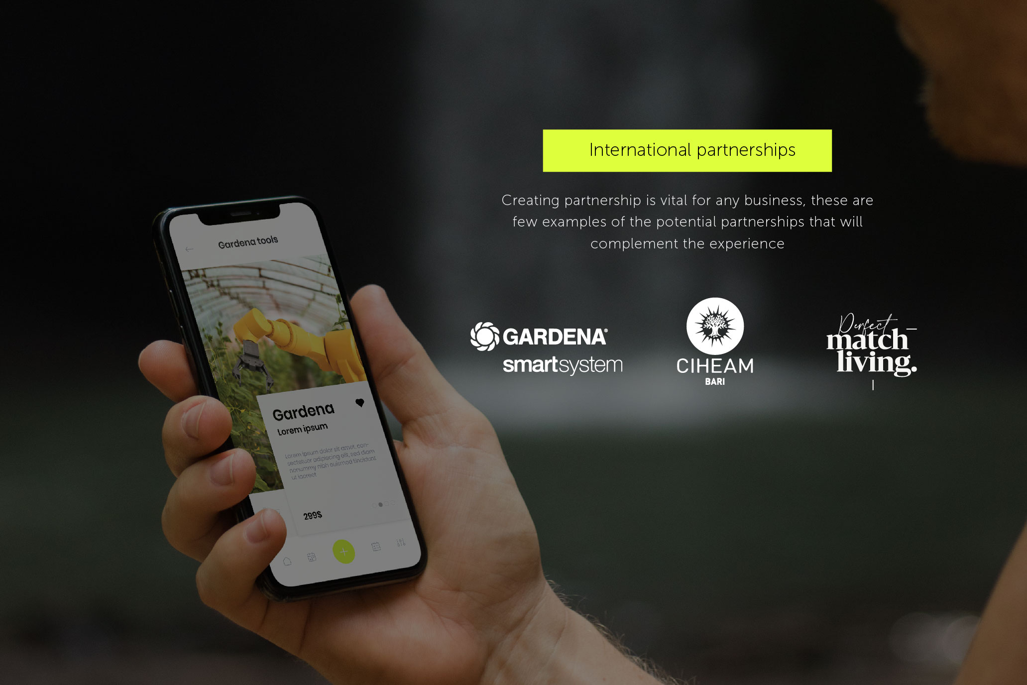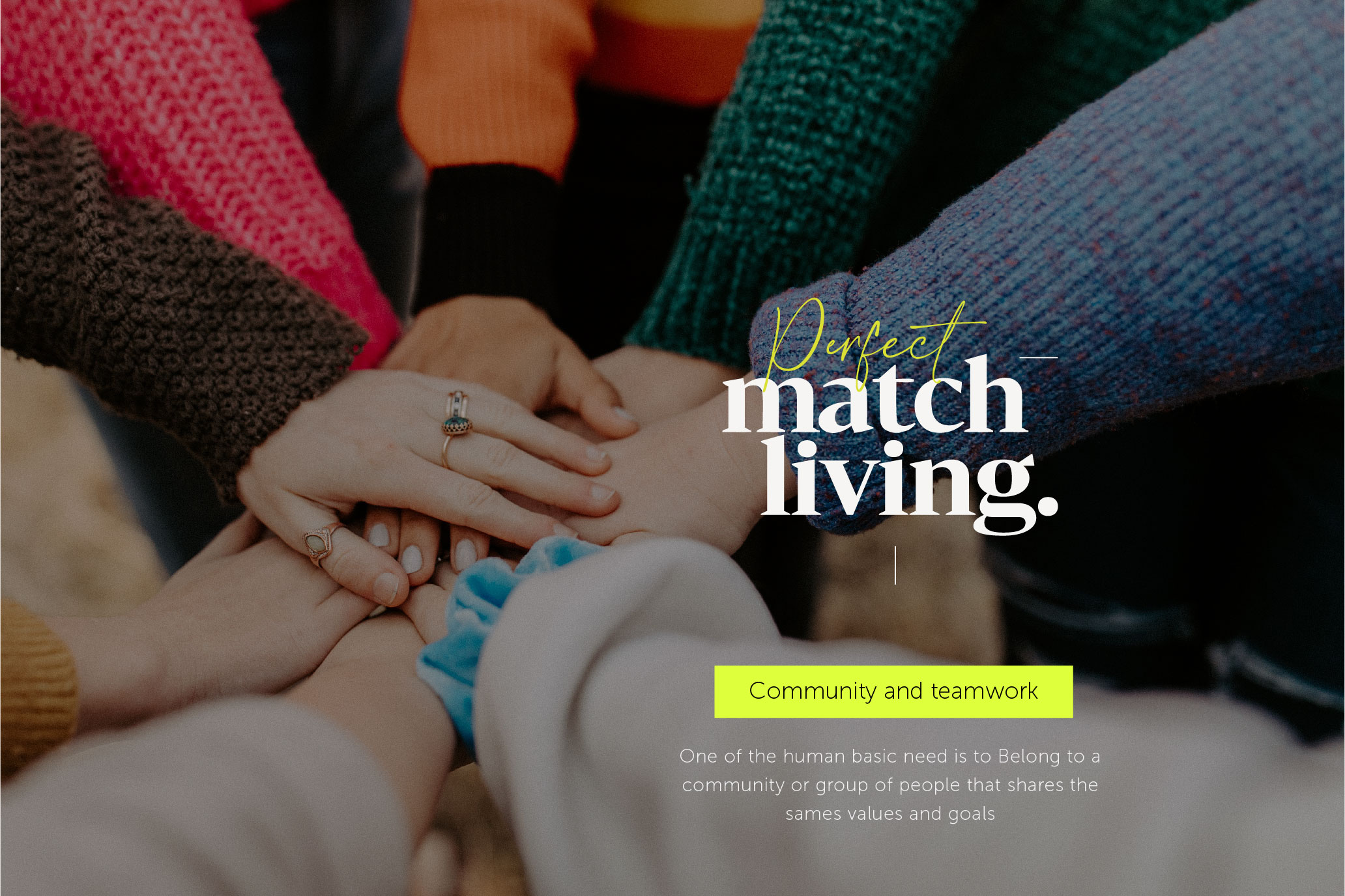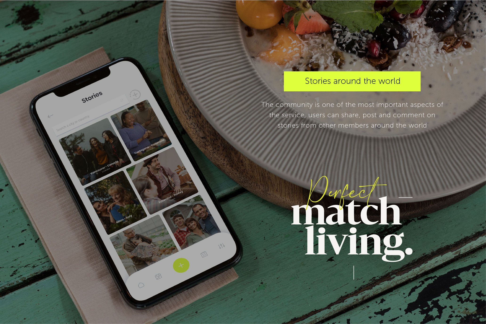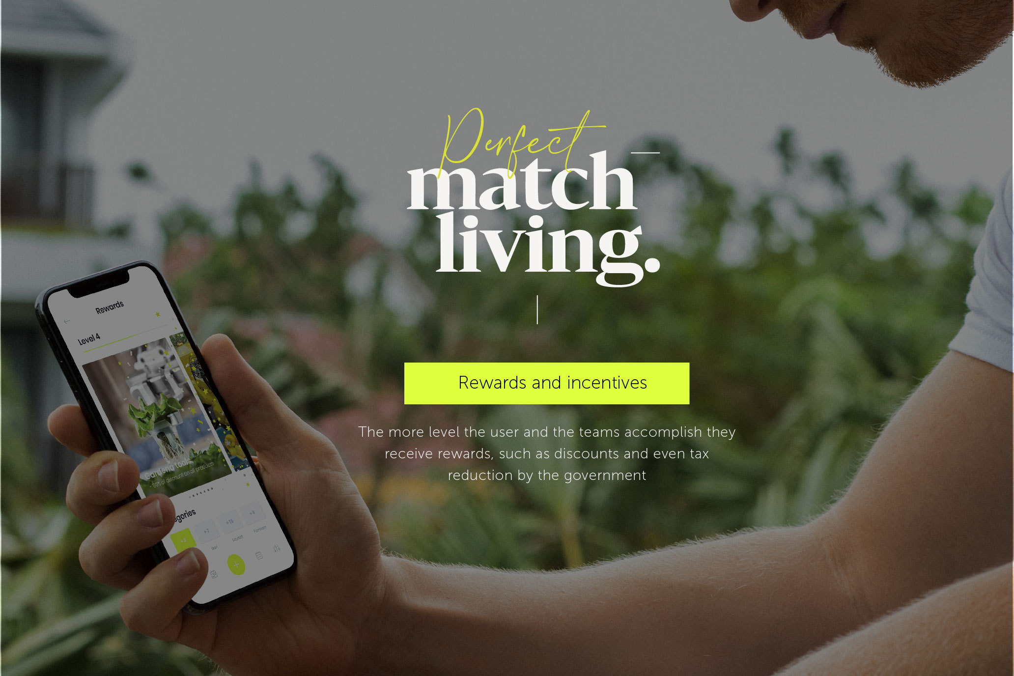 The service ‘Perfect Match Living’ is the platform that helps people build and organize a residential sustainable agriculture system within a community. It addresses the issue of sustainable food production which is a concept that involves cultivating plants with livestock on small inclined spaces with techniques such as; hydroponic and compost systems where there is a lack of available land space for healthy food. Even more, it forms a circular food production and food waste system with integrated technological tools, creates a balanced environment, and builds community by teamwork giving different roles to its users depending on their needs and talents.