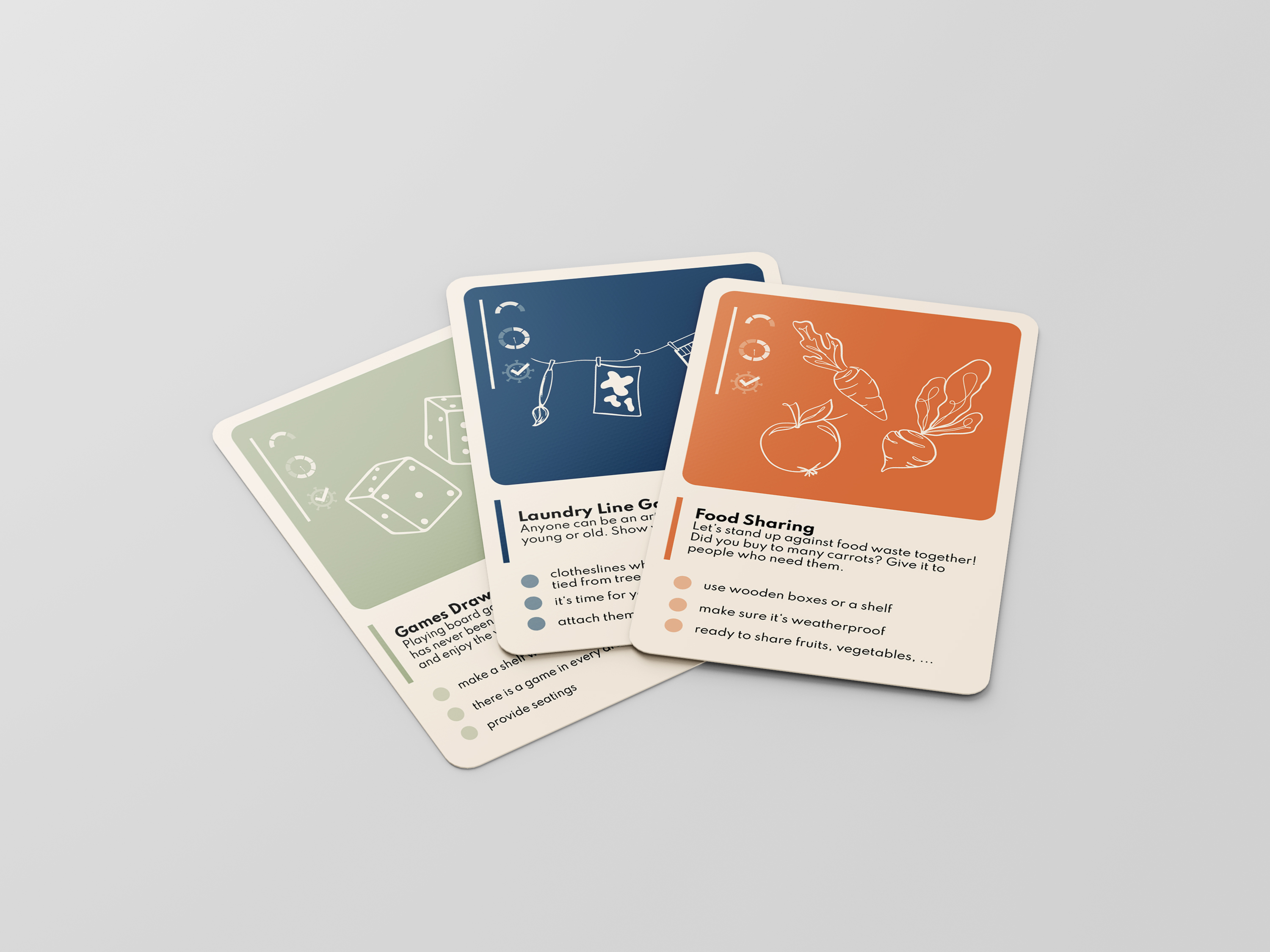 Therefore we chose playing cards as our medium. Playing cards underpin the playful and creative approach of our project. Moreover, cards are popular with a wide range of age groups. Whether Uno, Black Jack, Mau-Mau or Solitair – they are internationally known and popular. Our aim is not to give too many strict specifications and instructions regarding the projects. For this reason, we have not chosen photographs, but illustrations. These are meant to provide ideas and inspiration, but still give the freedom for individuality. In addition, you are encouraged to use used materials that you already have at home and not to buy them new.