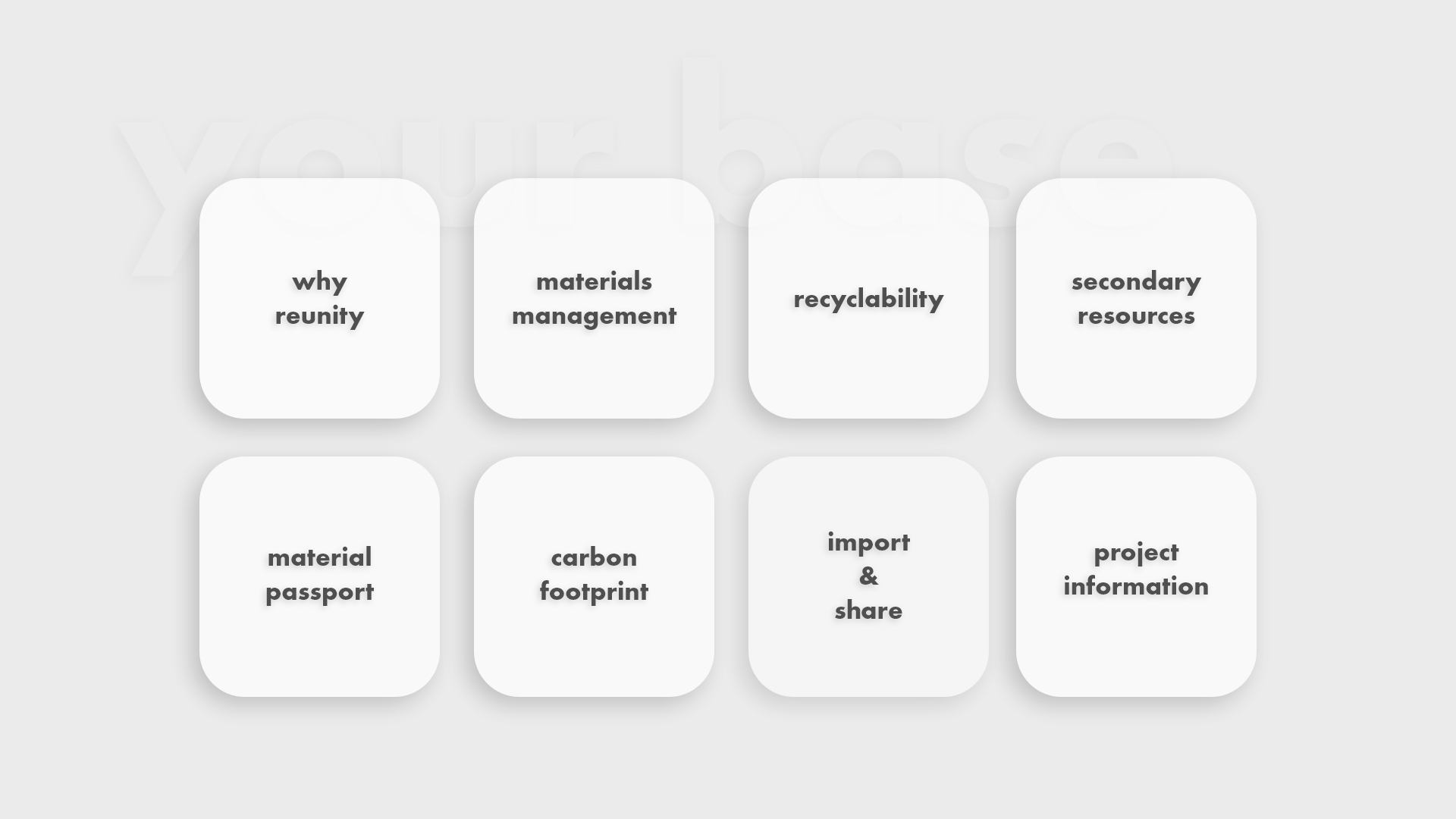 The software ecosystem „reunity” includes 1) materials management 2) inner-city materials flow management 3) recyclability 4) carbon footprint 5) material passport. „reunity“ lays the foundation for a new value creation logic in the architecture and inner-city materials flow management.The data-based approach helps to preserve, obtain and improve transparency and quality.