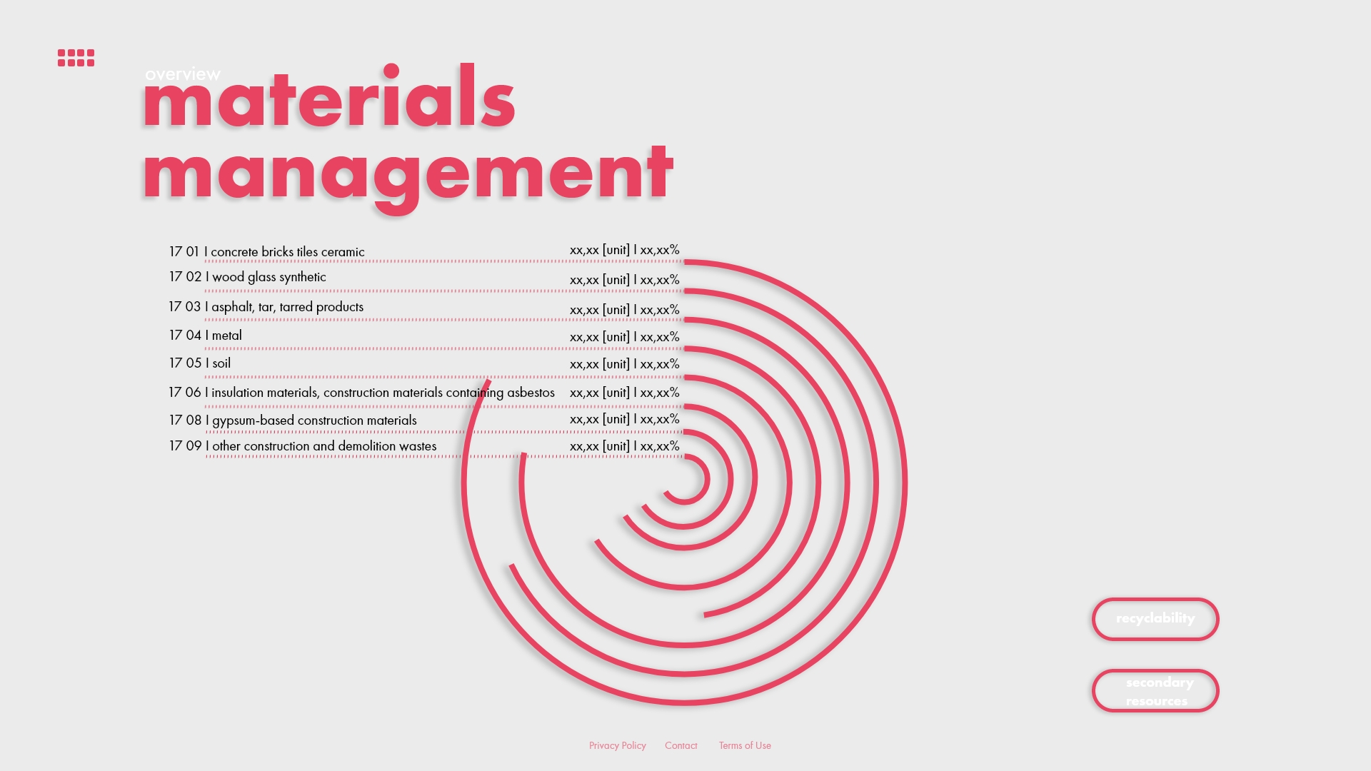 If you look at modern cities the need for sustainability and the transparent connection of processes is evident. The main issue is an increasing unused anthropogenic deposit of resources in cities and at the same time an increasing global sacarcity of resources. Every day tons of our dwindling resources are used in our cities without a controlled material flow management system. This leads to an ignorance surrounding useful resources and reinforces the lack of secondary materials trade transparency which labels recyclates as an unrelieable and no forseeable resource. The circular economy in the building industry is still in its infancy and its translation in design processes not clear to everyone. The aim is to provide a digital software ecosystem to decrease the lacks of transparency and to visualize and support the dependencies of sustainable management within the construction-project. Starting with Information design previously invisible information becomes transparent and tangible through appropriate data visualizations. This helps to minimize the inherent complexity of resource management and construction-projects.