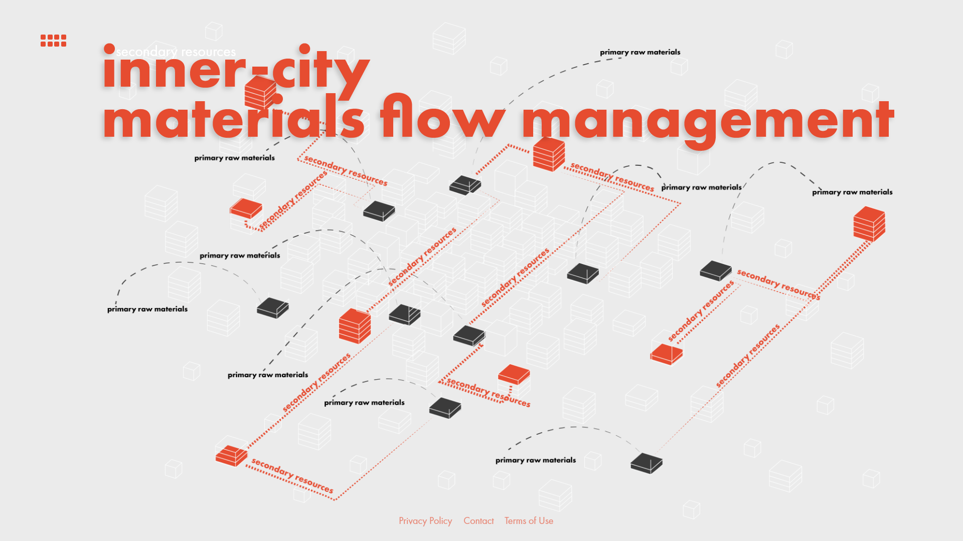If you look at modern cities the need for sustainability, connection of processes is evident. The main issue is an increasing unused anthropogenic deposit of resources in cities and at the same time an increasing global sacarcity of resources. Every day tons of our dwindling resources are used in our cities without considering a deconstruction concept to reuse building materials in a forseeable time. This leads to an ignorance surrounding useful resources and its quantities and qualities. This reinforces the lack of secondary materials trade transparency which labels recyclates as an unrelieable and no forseeable resource. The building industry is a significant part of our carbon footprint but the clear way to change and its methods are intransparent and inaccessible for the general public. Therefore it is still a cumbersome and uneconomic. The circular economy in the building industry is still in its infancy and its translation in design processes isn’t clear to everyone.